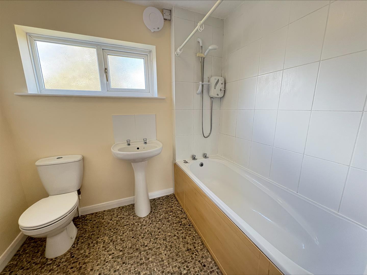 A well proportioned bathroom suite consisting of a panelled bath with shower over, w/c, wash hand basin, tiled splashback, extractor, uPVC double glazed window to rear, heated towel rail.