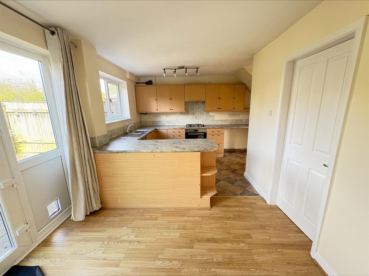A spacious and light area benefitting from a range of wall, base and drawer units with contrasting worktop over, 1.5 bowl stainless steel sink unit with drainer and mixer tap, space for washing machine, fridge and freezer, integrated oven with 4 ring gas hob with extractor over, tiled splashbacks, uPVC double glazed window and door to rear garden, door into lounge, radiator.
