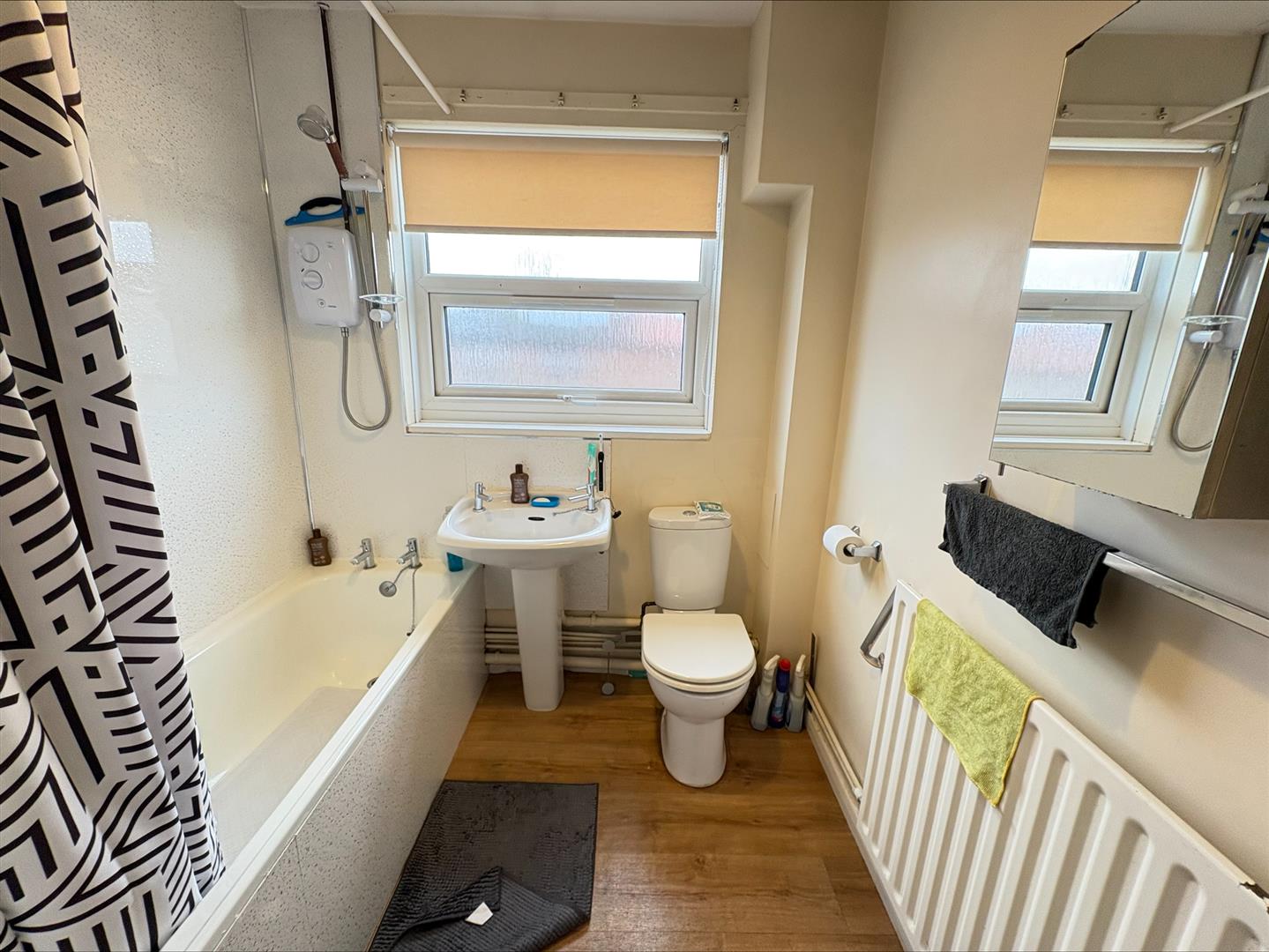 Fitted with a three piece suite consisting of a w/c, wash hand basin and panelled bath with Triton electric shower over with curtain rail, part tiled walls, uPVC double glazed window to the front, radiator and mirrored cabinet on wall.