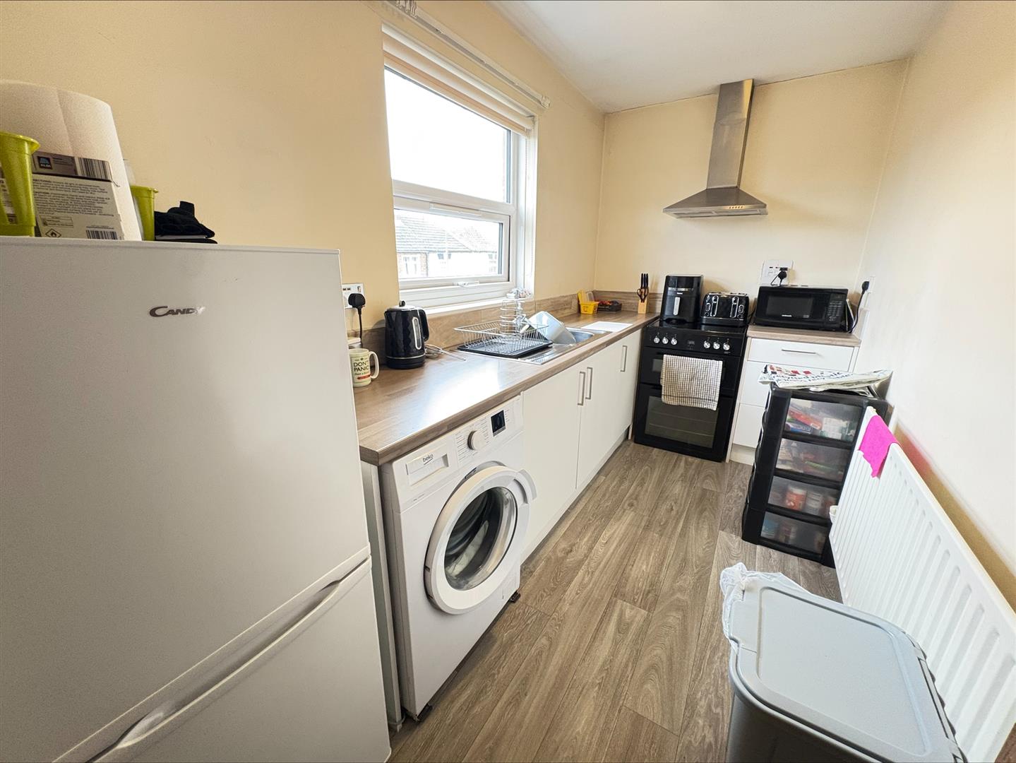 Fitted with a range of base and drawer units with contrasting worktops over incorporating a stainless steel sink and drainer, space for oven and hob with extractor over, space for washing machine, Danfoss thermostat, space for fridge freezer, uPVC double glazed window to the front and a radiator.
