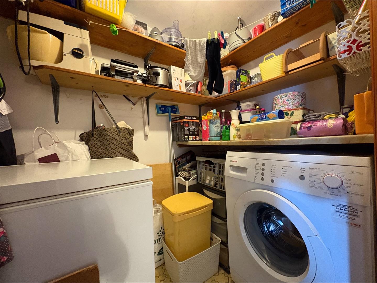 Consisting of shelving, worktop, and offering space for a washing machine.
