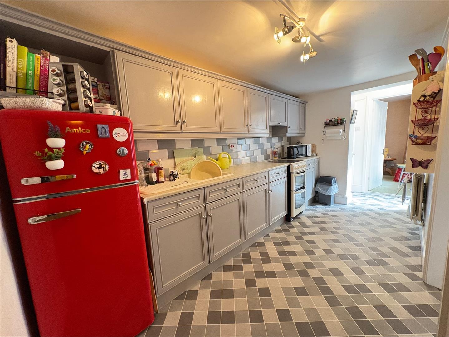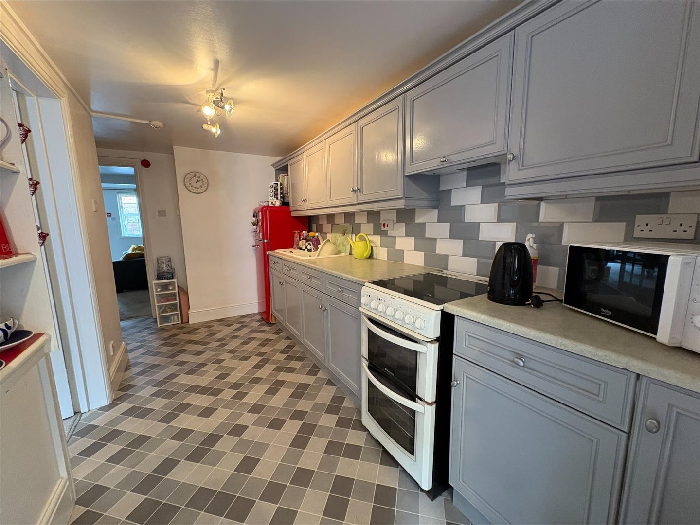 A light and well proportioned kitchen area provides grey wall, base and drawer units with contrasting worktop, space for freestanding fridge freezer, a radiator, space for electric hob and oven unit. sink and drainer.