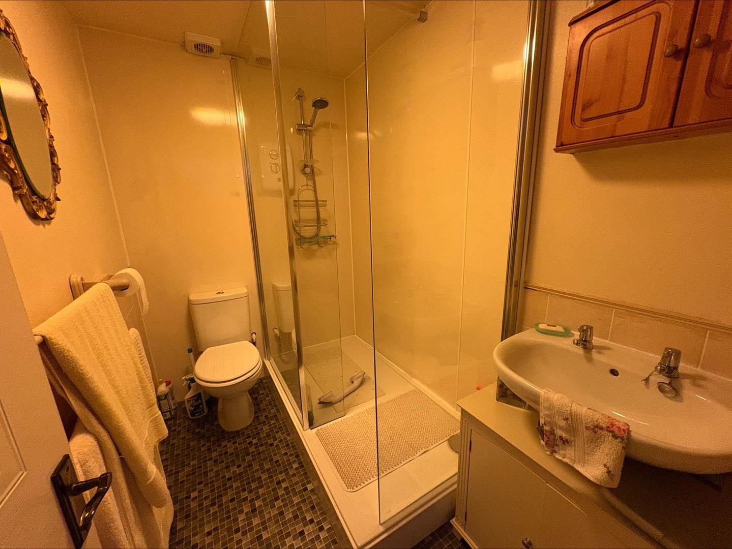 Comprising sink unit, low flush W.C., glass shower cubicle with Triton Electric shower, extractor, low level tiled walls and panels around shower cubicle. Radiator, shaver point, shelving and wall mounted vanity cupboard.