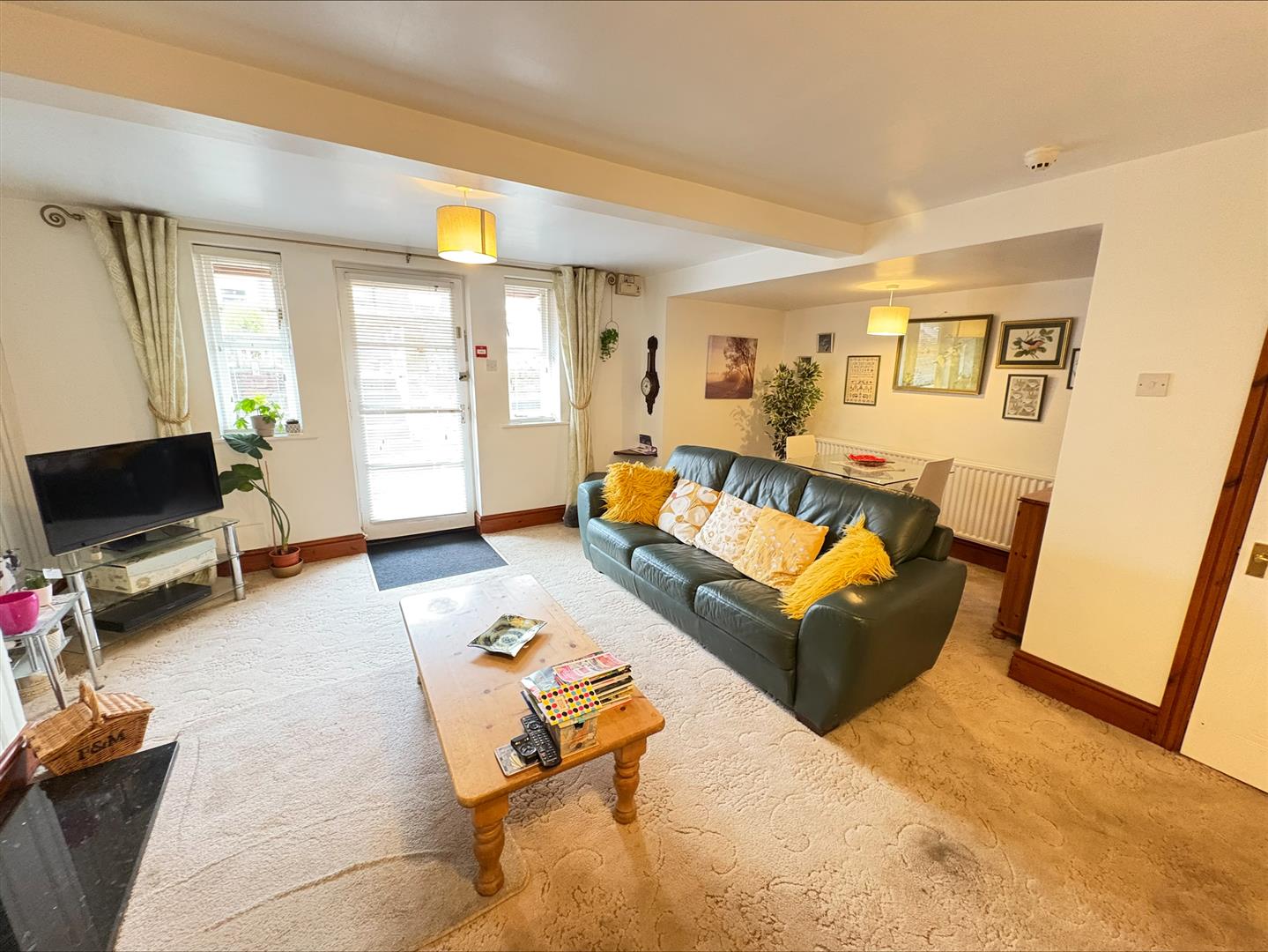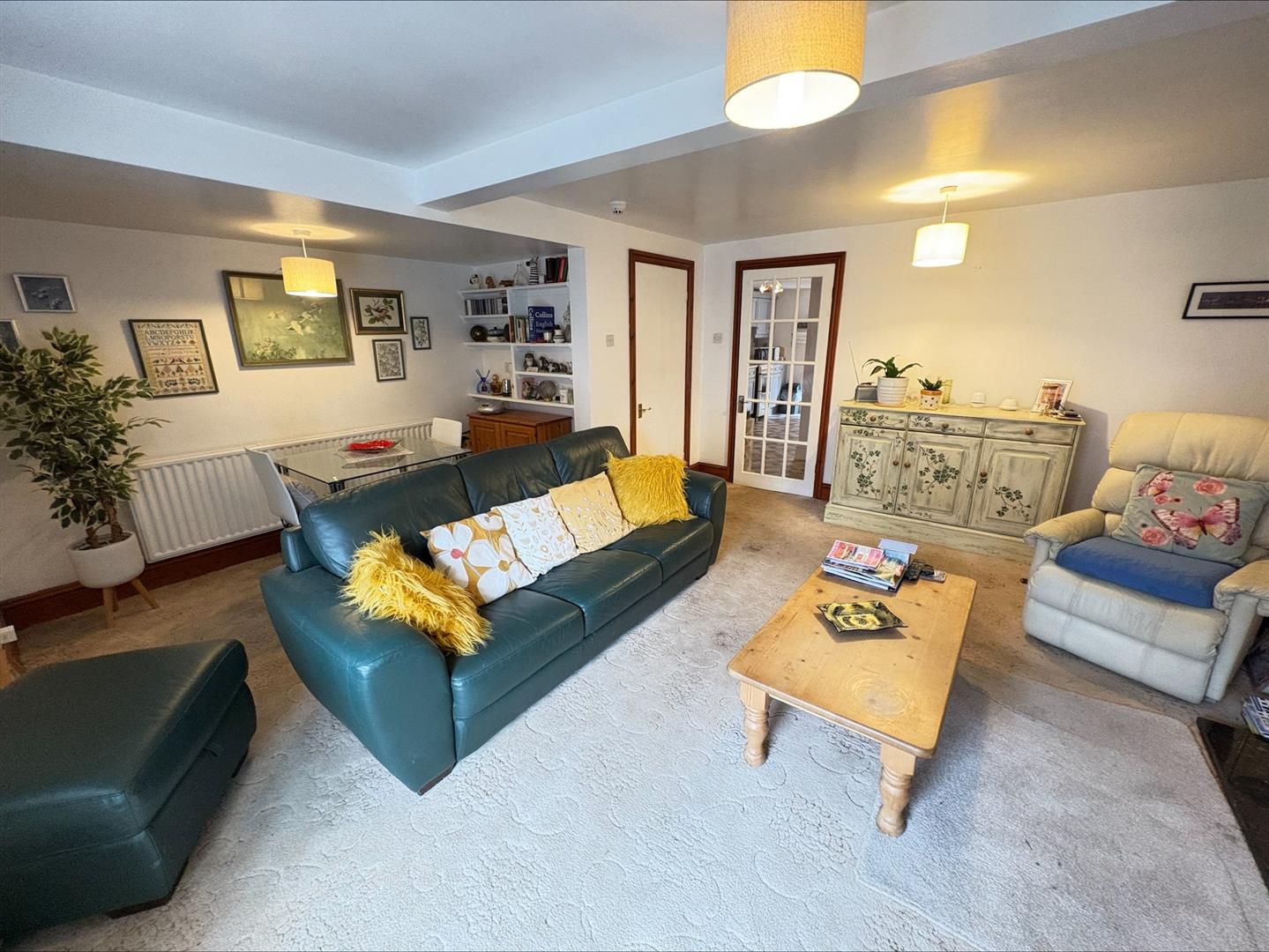 A spacious and welcoming room providing a radiator, single glazed door and windows to front garden. A central feature to the room is the coal effect gas fireplace which provides secondary heating. A wall mounted consumer unit, tv point and door to;