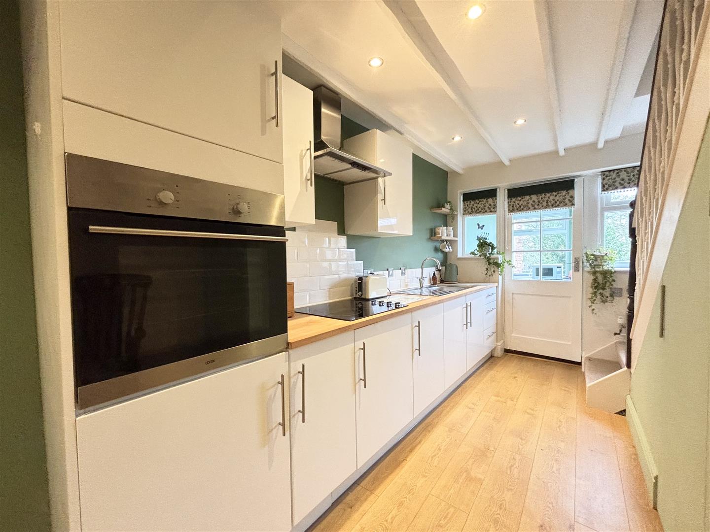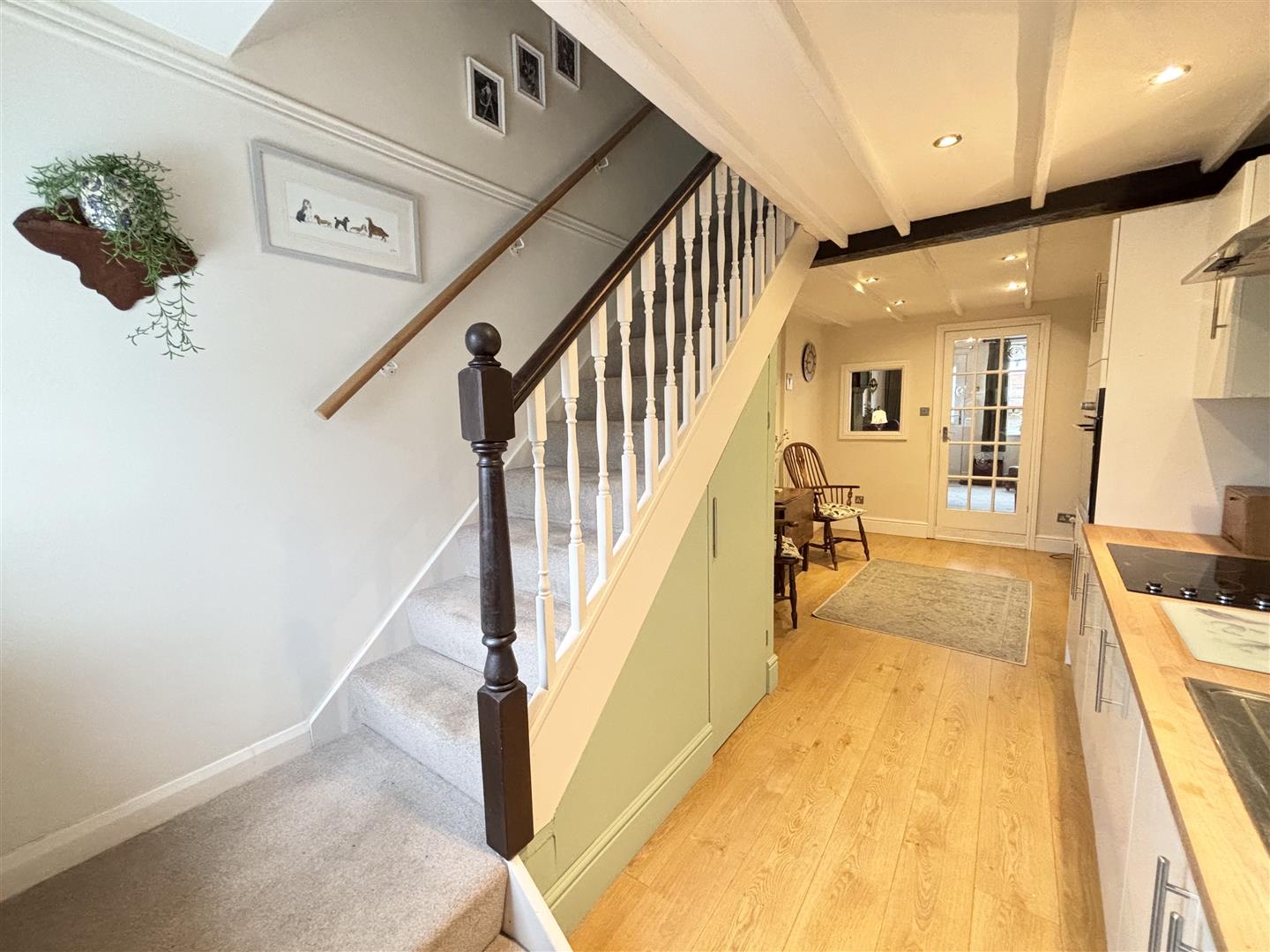 The kitchen is fitted with a range of wall, base and drawer units with wooden worktop over incorporating a one and a half bowl stainless steel sink with drainer and mixer tap. There is an integrated ‘Logik’ oven and 4 ring ‘Belling’ hob with extractor above and space for a fridge freezer. Stairs lead up to the first floor with a useful under stair cupboard space, tiled splashbacks, spotlights to the ceiling, vertical radiator and space for a dining table. There is a uPVC double glazed window to the rear and timber door into utility.