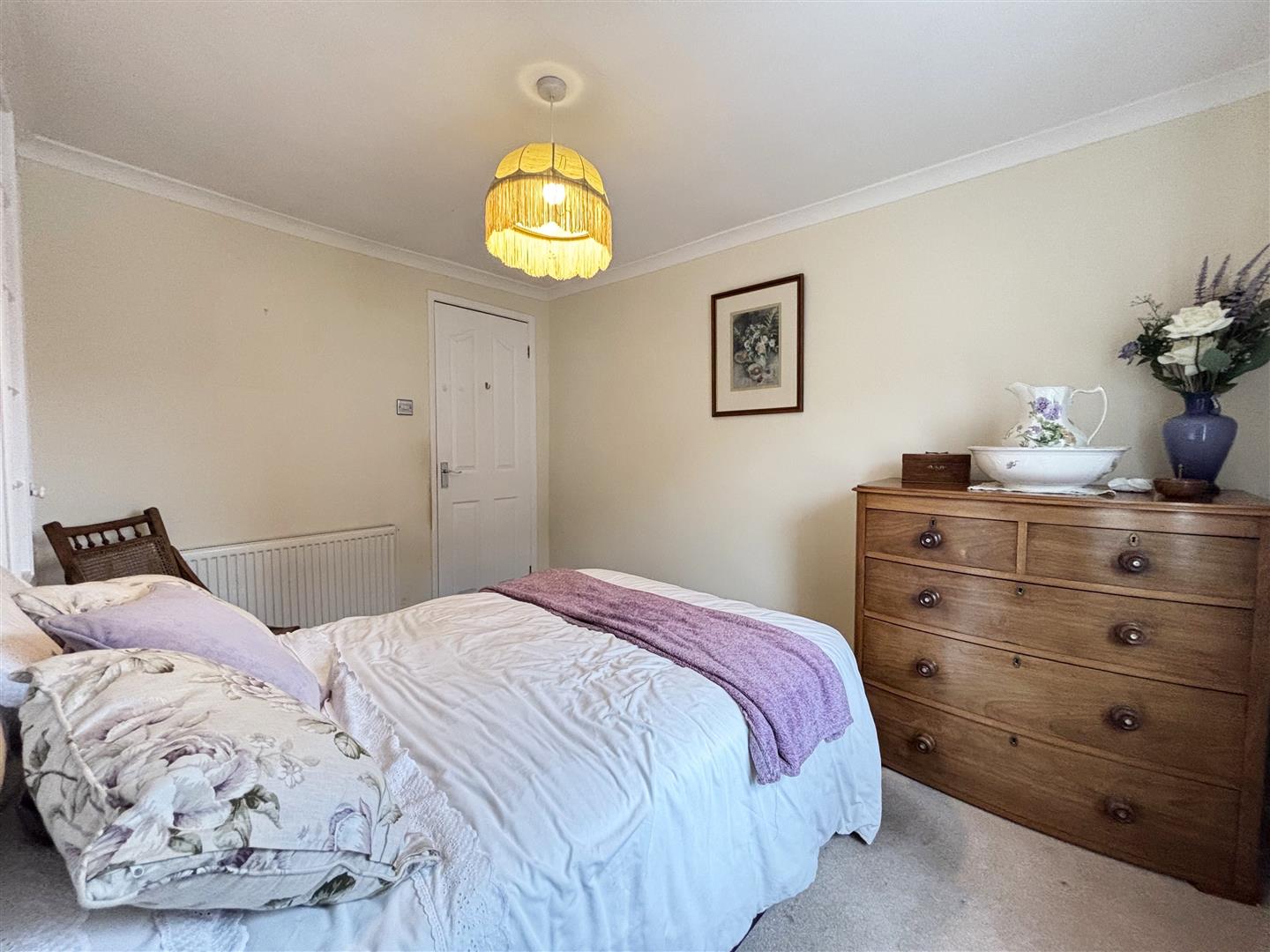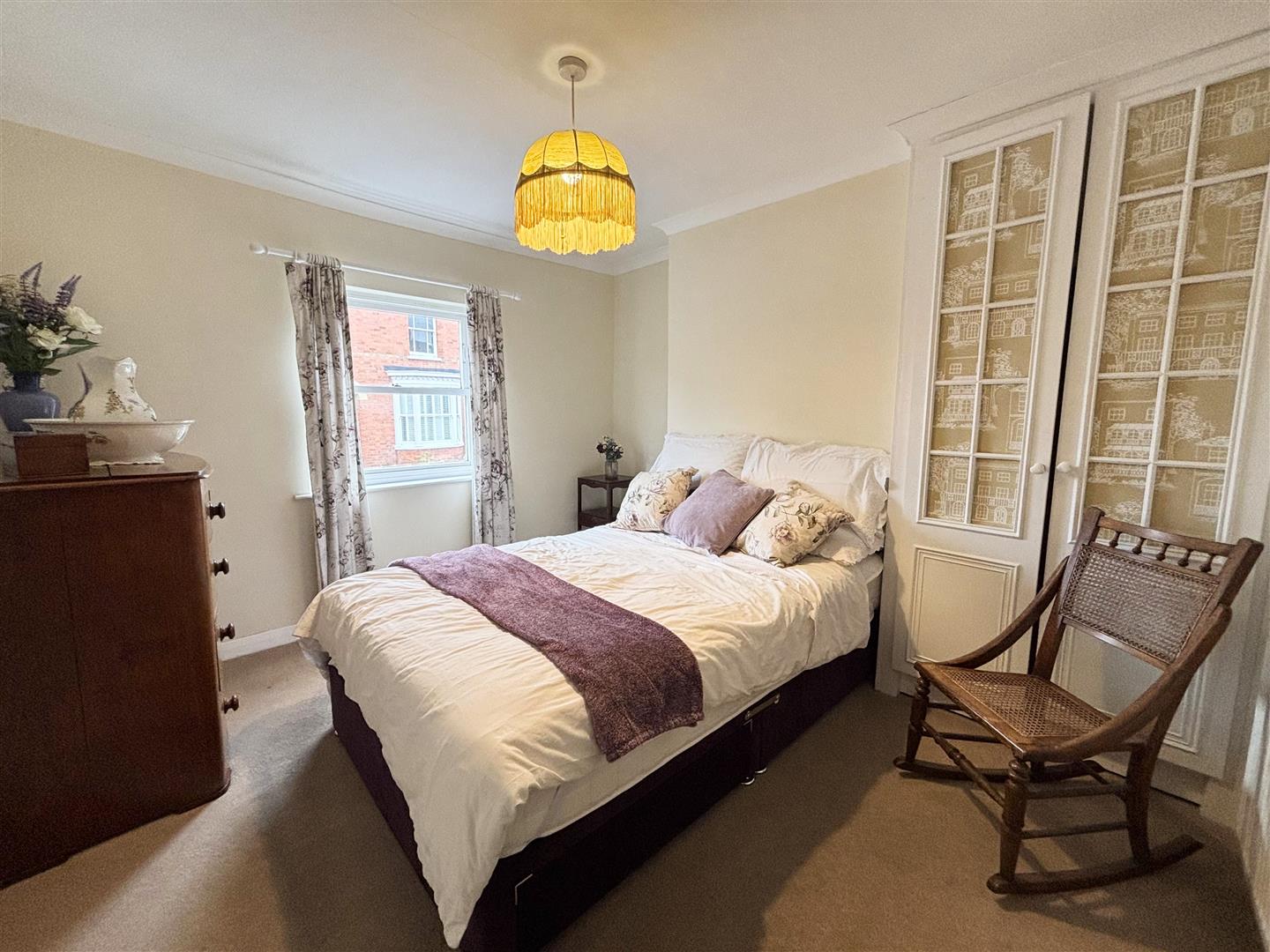 Double bedroom with radiator, coving to the ceiling, built in wardrobe and single glazed timber window to the front.