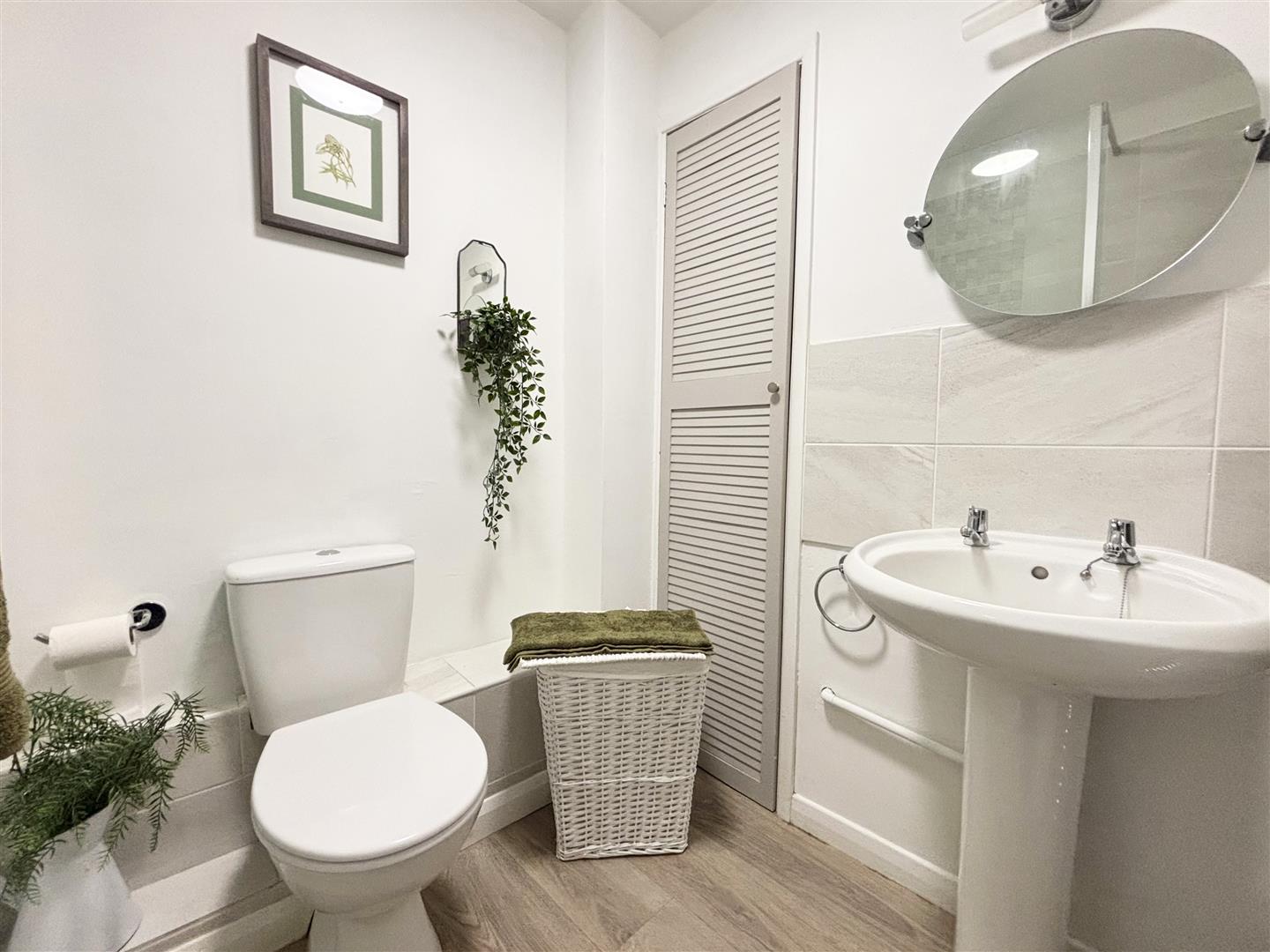 Fitted with a modern three piece white suite consisting of a large shower cubicle, W.C. and wash hand basin, with tiled splashbacks, heated towel rail, shaving point, extractor, lino floor and fitted mirror with light above. An airing cupboard housing ‘Ideal Logic’ boiler and hot water cylinder.