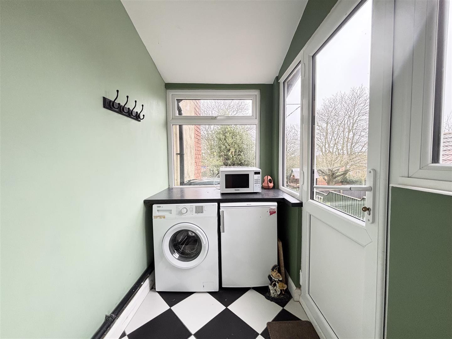 With worktop space with space and plumbing below for washing machine and tumble dryer, tiled floor, uPVC double glazed windows to side and rear with UPVC door out to the garden.
