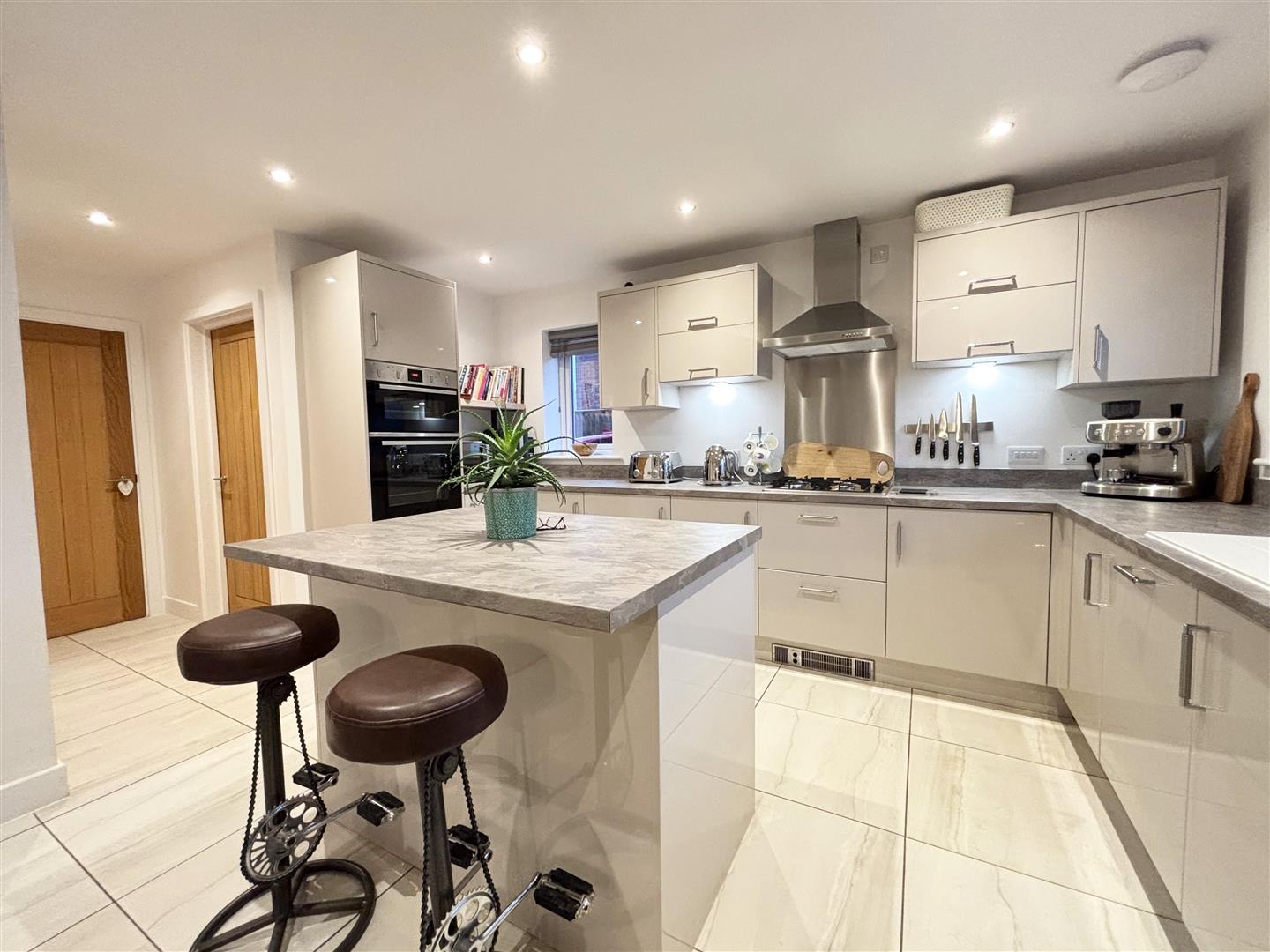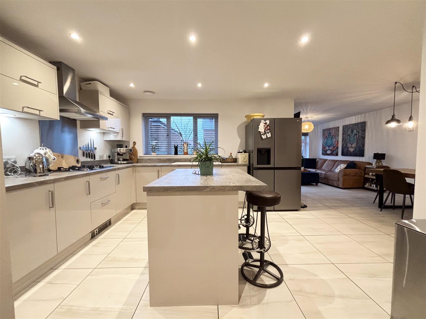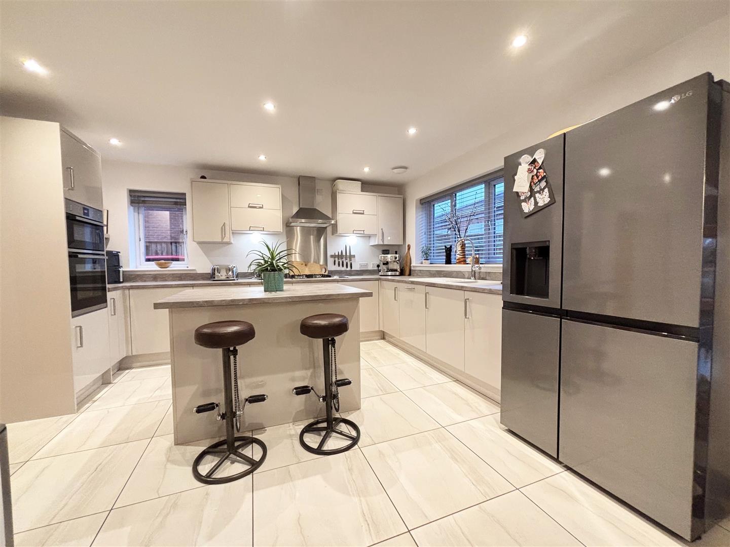 The kitchen is fitted with a range of wall, base and drawer units with a complimentary worktop over incorporating a 1.5 bowl sink unit with drainer and mixer tap, benefitting from a range of integrated appliances including an oven and grill with 4 ring gas hob with extractor over and integrated dishwasher. The is space for an American style fridge freezer, a central island with matching cupboards and matching worktop, dual aspect uPVC double glazed windows to the side and rear, spotlights to the ceiling, tiled flooring, storage cupboard and extractor. A door leads into the utility room.