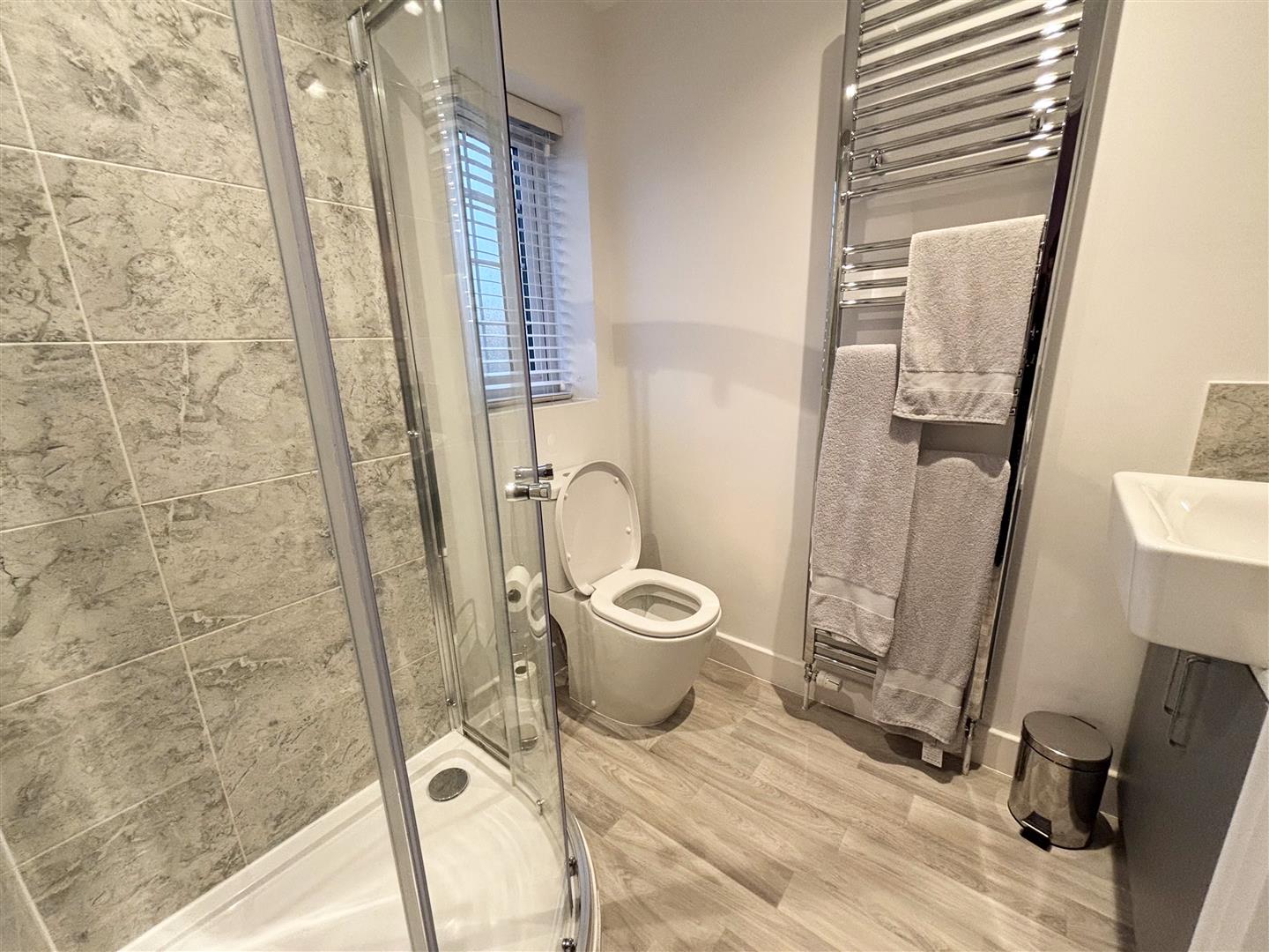 Fitted with a three piece suite consisting of a corner shower cubicle, w/c and wash hand basin with mixer tap and cupboard below. There is a heated towel rail, shaving point, uPVC double glazed window to the front, spotlights to the ceiling, extractor and tiled splashbacks.