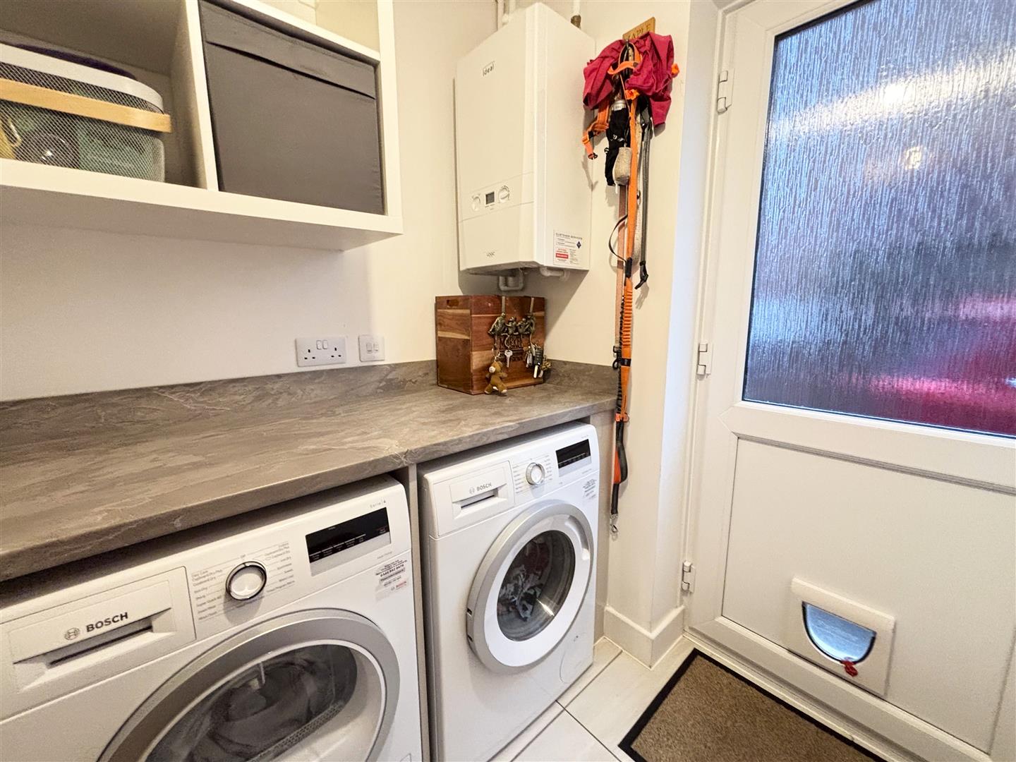 Worktop space with space and plumbing below for washing machine and tumble dryer, wall mounted ‘Ideal’ boiler, tiled floor, radiator, extractor and door to the side.