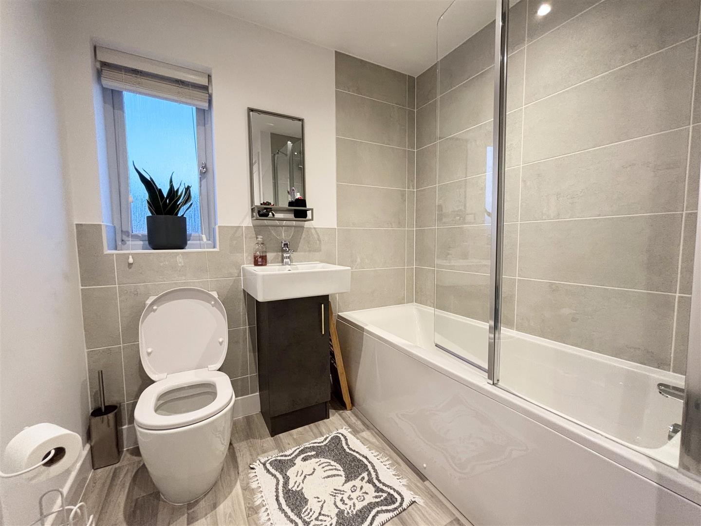 Modern bathroom fitted with a three piece suite consisting of a panelled bath with shower over and glass shower screen, w/c and wash hand basin with mixer tap and cupboard below. The is a uPVC double glazed window to the rear, tiled splashbacks, heated towel rail, extractor, spotlights to the ceiling and an airing cupboard housing the hot water cylinder.