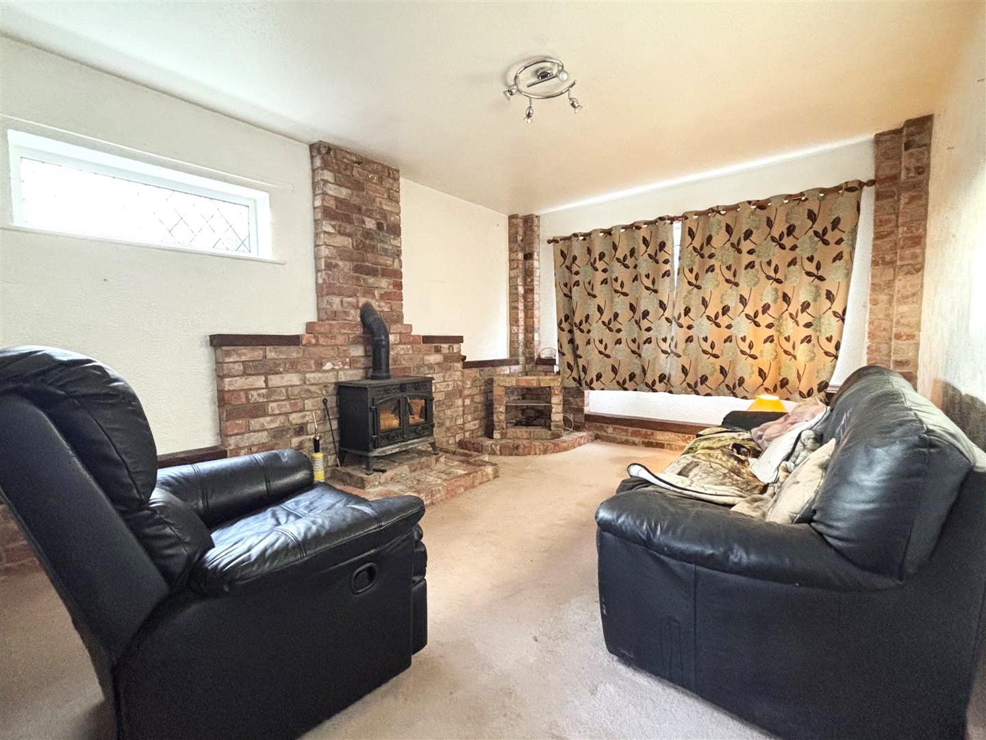 Feature log burner in bricked surround, dual aspect uPVC double glazed windows to the front and side and a radiator.