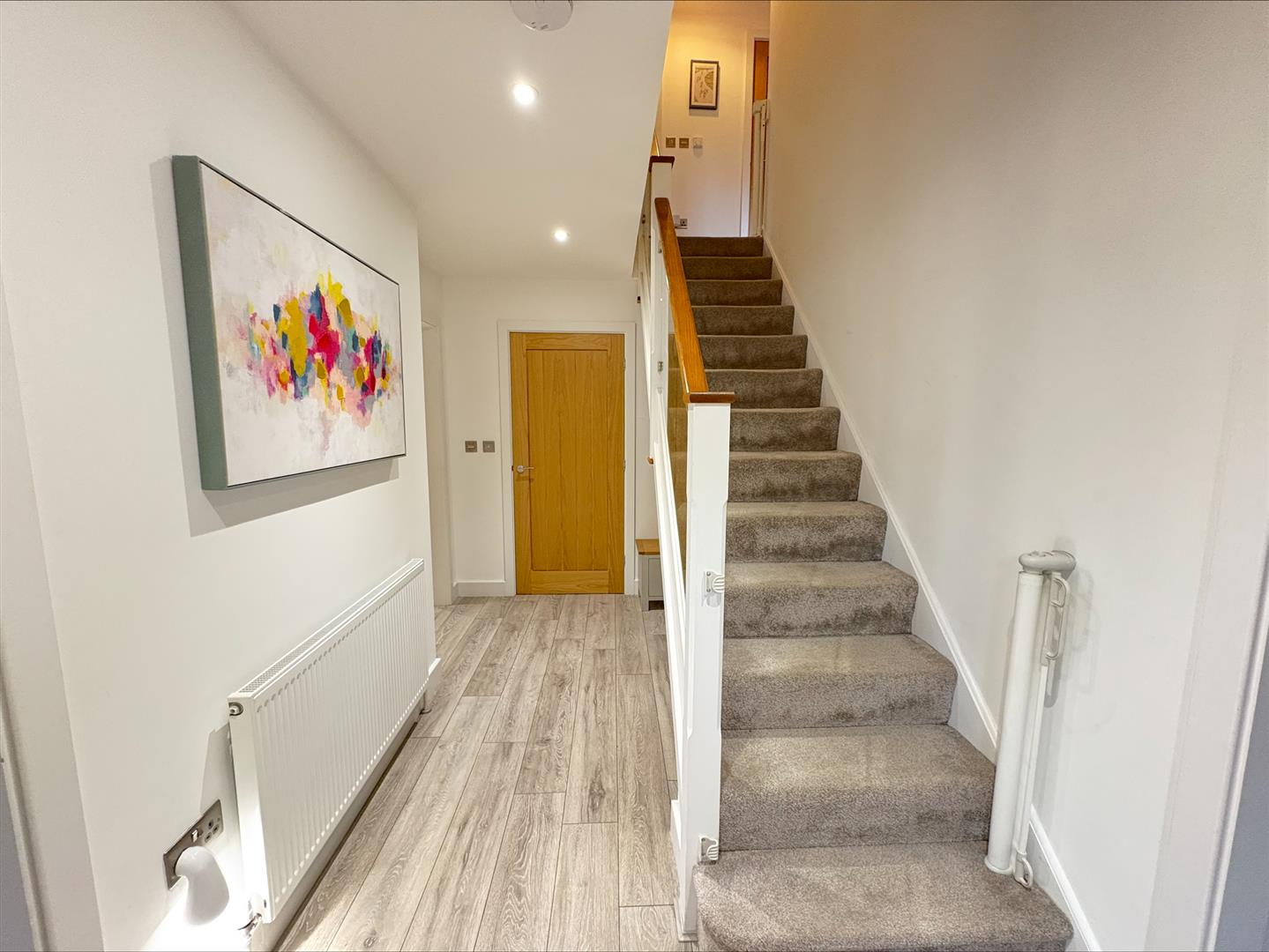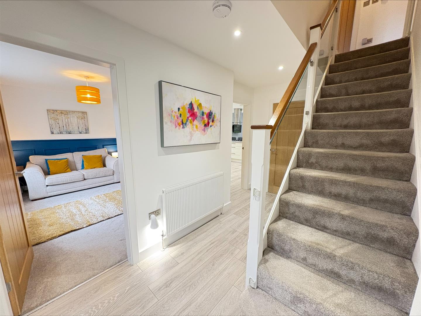 Enter via a uPVC double glazed door with diamond glass feature panes into the welcoming hallway with staircase to the first floor with glass balustrade and a useful understair storage space, there is a radiator and grey wood-effect flooring.