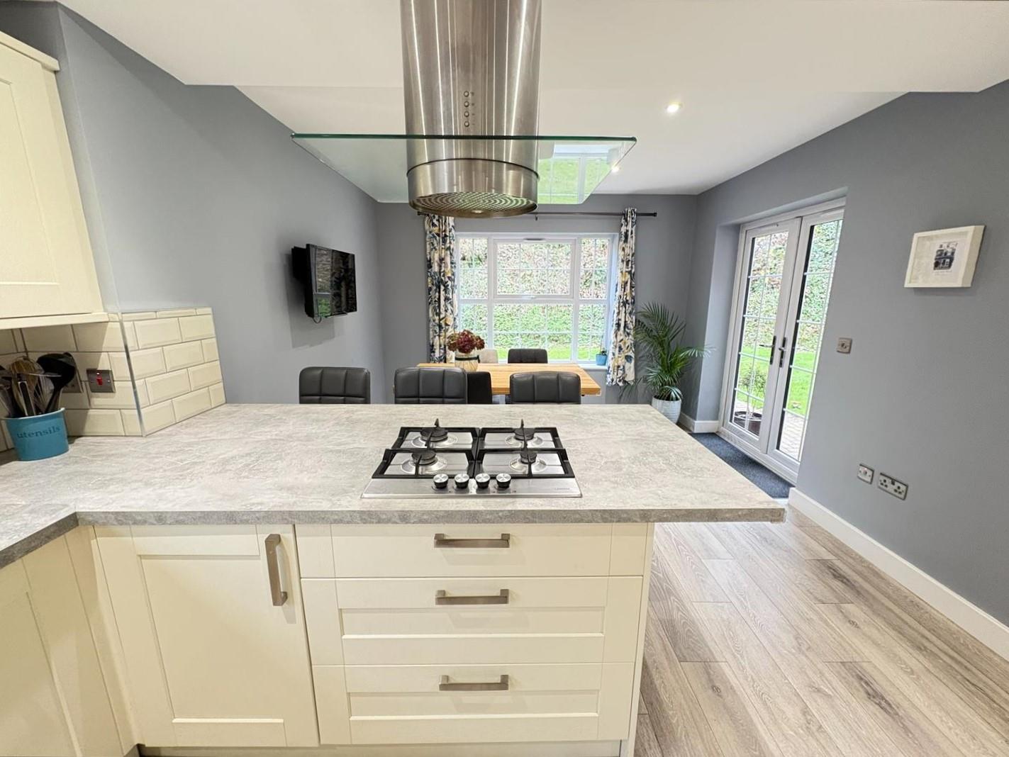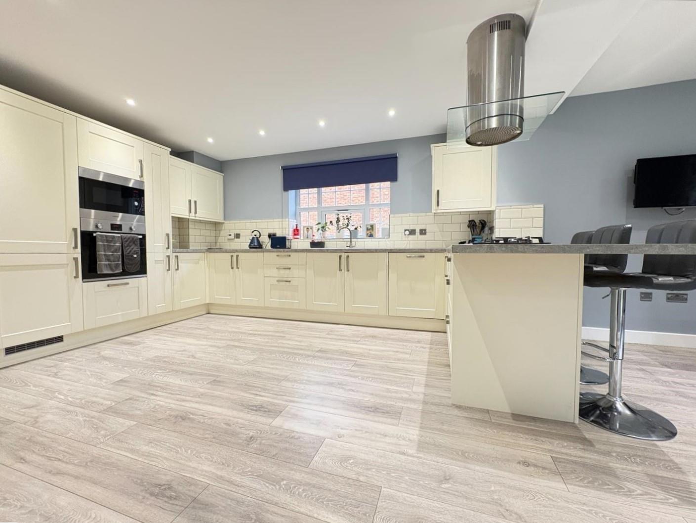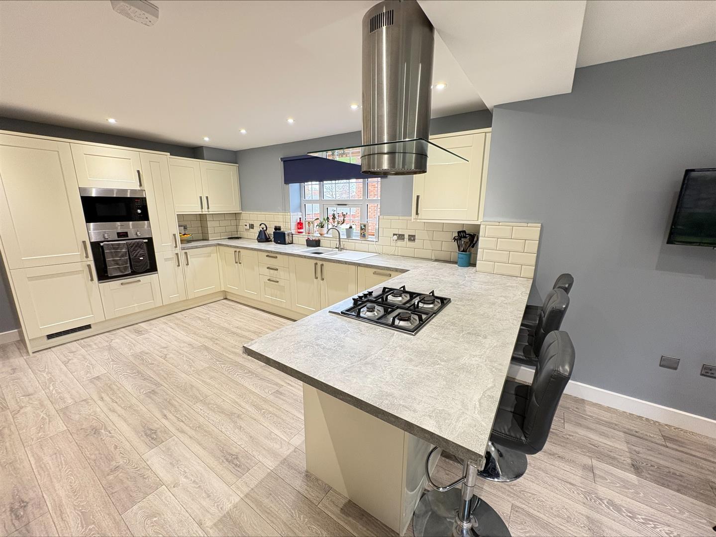 The kitchen is fitted with a range of cream wall, base and drawer units with contrasting grey worktop and cream splashback tiling, there is a 1.5 bowl sink with drainer and mixer tap, a range of integrated appliances including a fridge freezer, dishwasher, ‘Lamona’ oven and grill, ‘Lamona’ microwave and ‘Lamona’ 4 ring gas hob with extractor above. The worktop benefits from a breakfast bar capable of seating 4 people along with ample space for a dining table. There are uPVC double glazed windows to the side and rear with patio doors out to the garden, wood-effect flooring in grey, ample power sockets, spotlights to the ceiling, T.V aerial point and a radiator. A wall mounted cupboard houses the boiler and central heating cylinder with glass extractor unit.