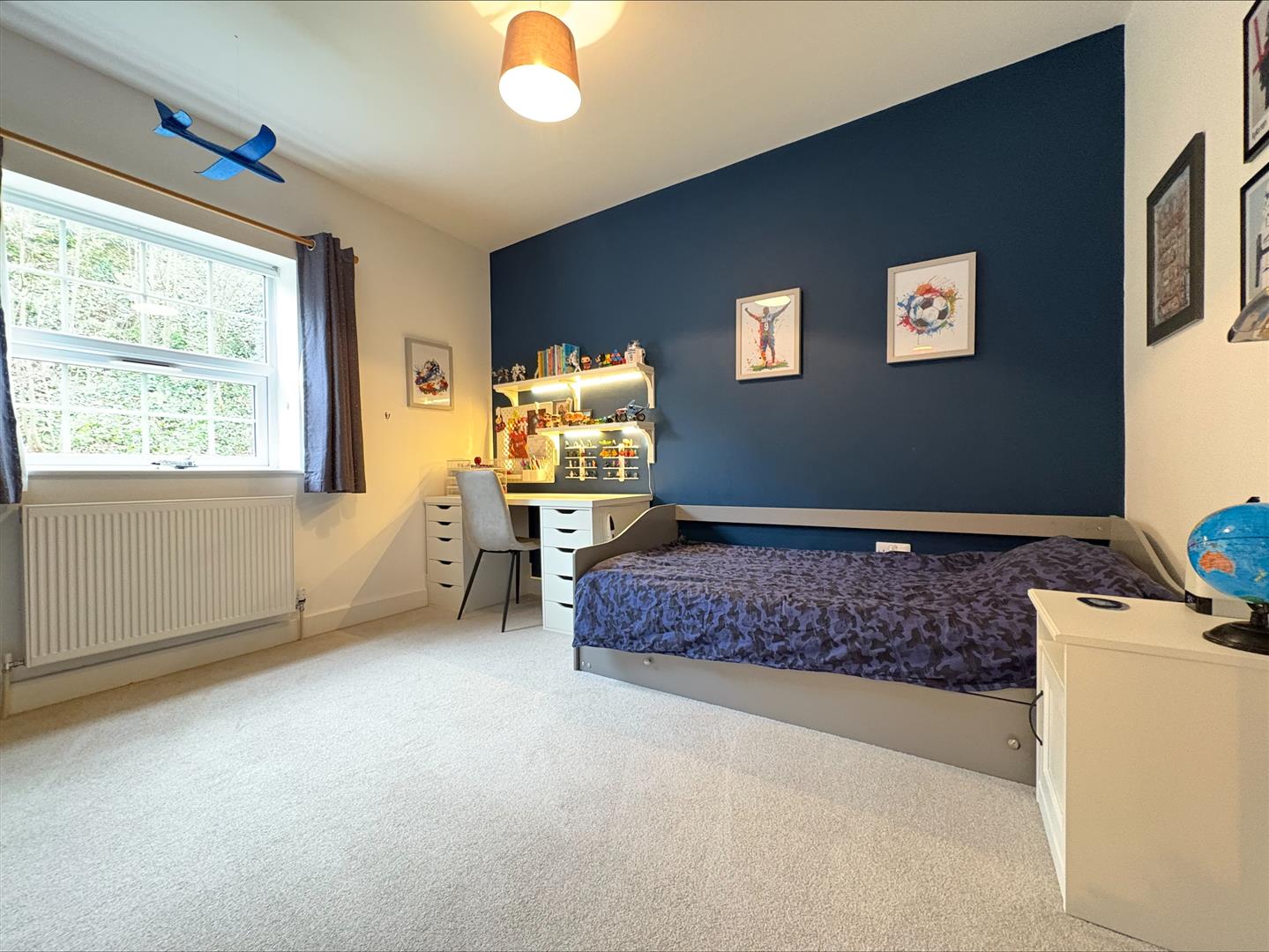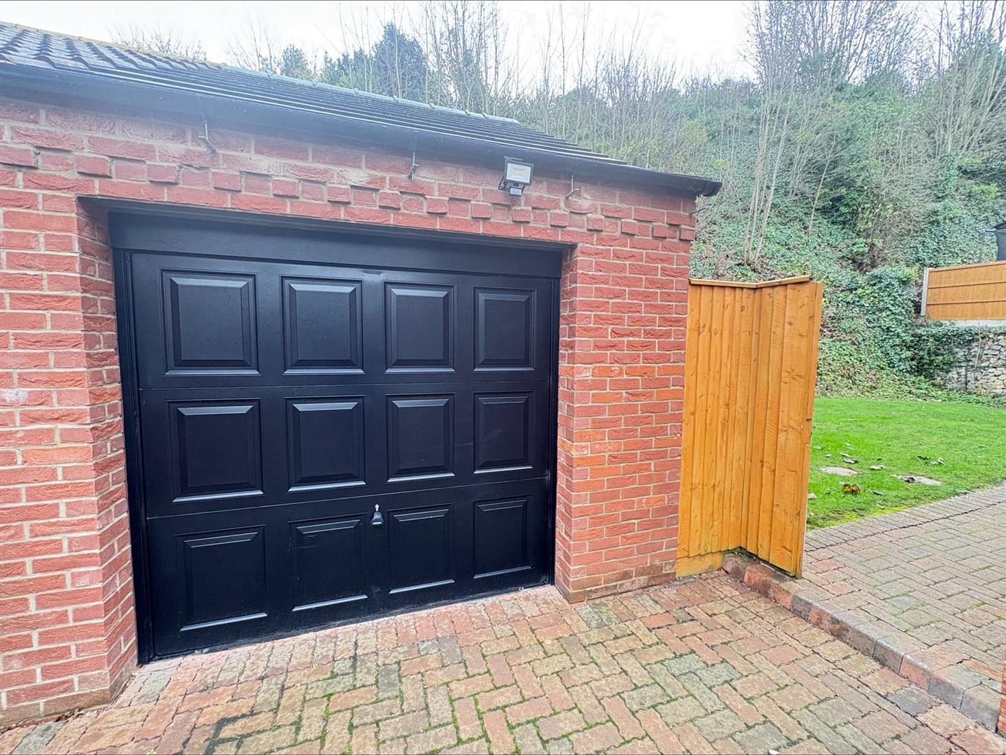 The rear garden is laid to lawn with brick paved patio area, perfect for alfresco dining in the summer months. The area is enclosed with fencing and a brick wall with a steep banking to the rear. Paved stepping stones lead down to the garage and storage shed behind, there is up and down lighting around the property and secure side paved bin storage area.
