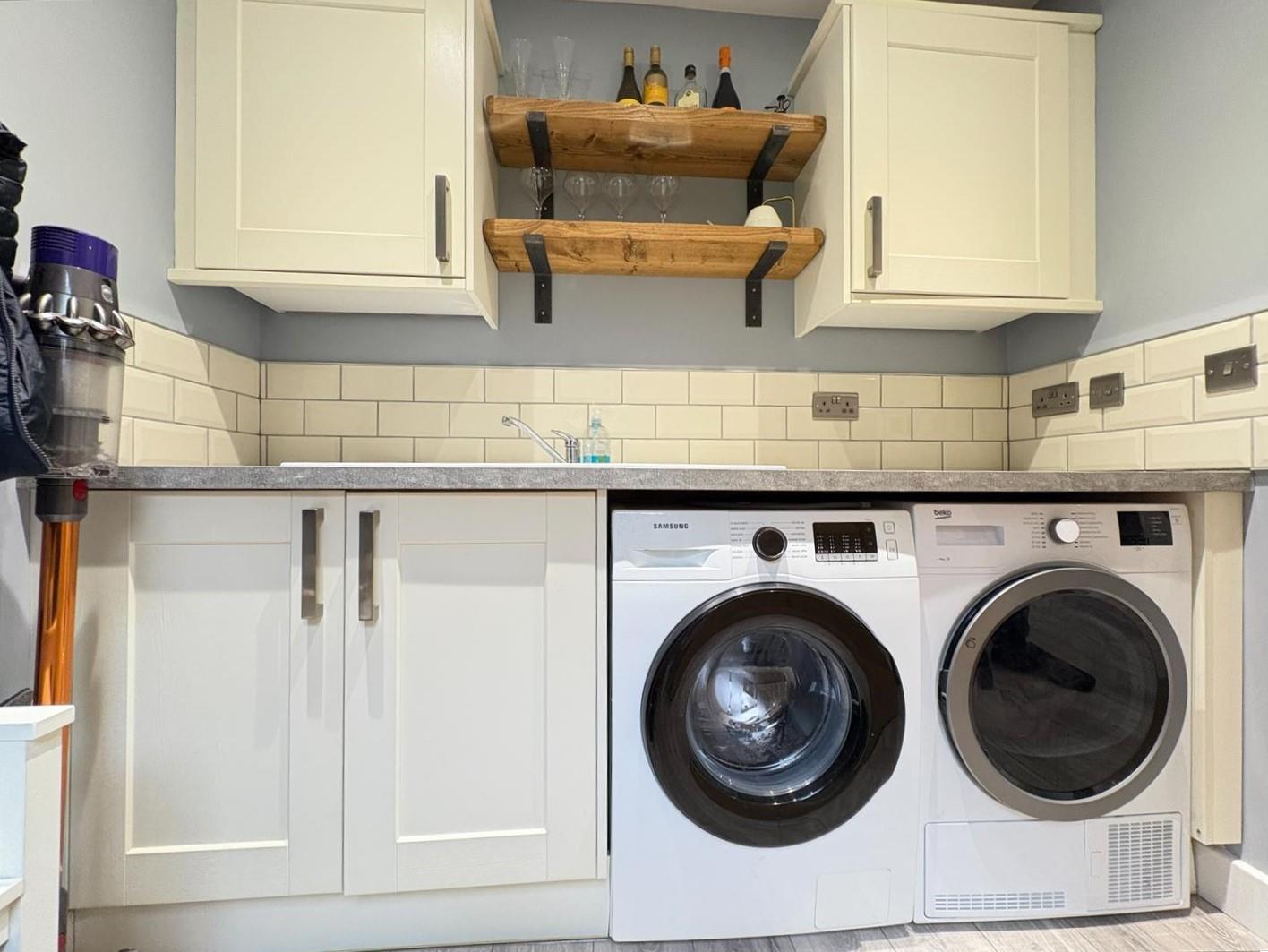 Fitted with white base and wall units with grey worktop over incorporating a large sink and drainer, there is space and plumbing for washing machine and tumble dryer, solid wood shelving, uPVC double glazed door to the rear garden, a radiator, cream tile splashbacks, extractor and continuation of grey wood-effect flooring.