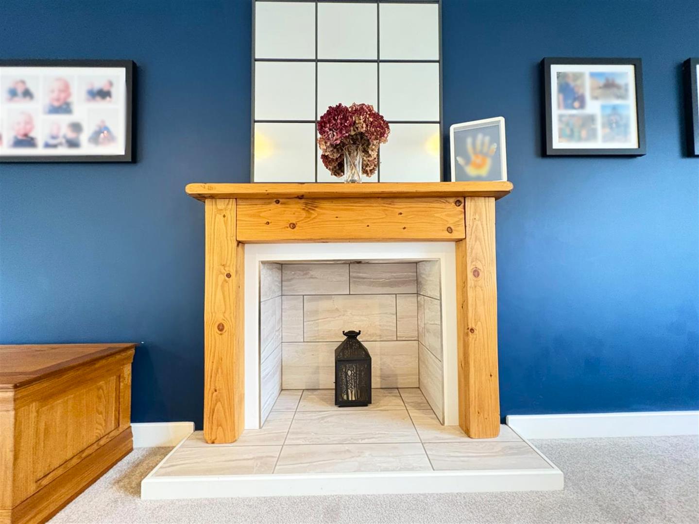Bright and airy room with uPVC double-glazed window to the front and uPVC patio doors to the rear, feature fireplace with grey tile hearth and back with timber mantle, T.V aerial point and a radiator.