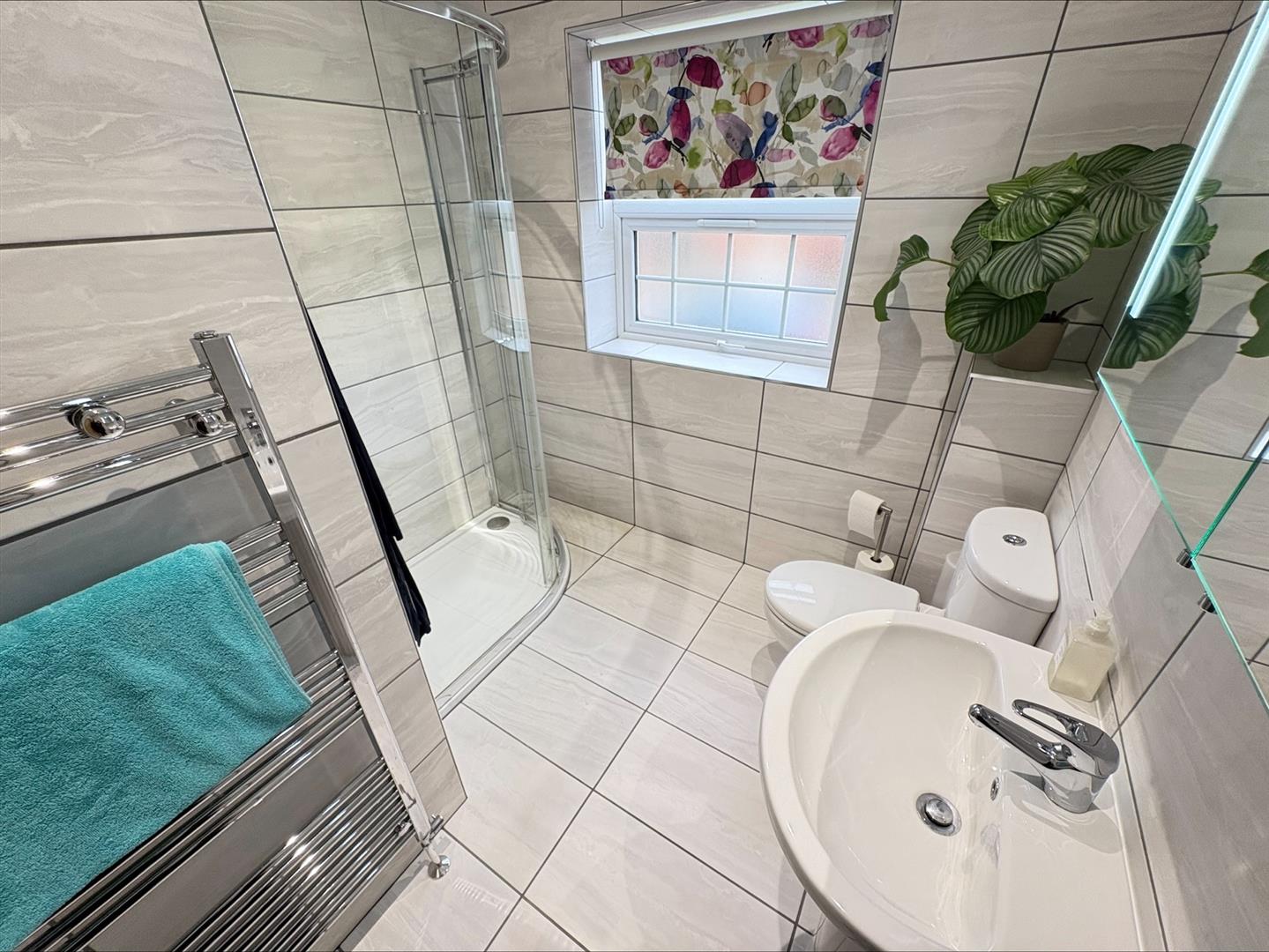 Fitted with a three piece suite consisting of a curved glass sliding door shower cubicle with large rainfall shower, w/c and wash hand basin. The room is fully tiled in grey with uPVC double glazed window to the front, heated towel radiator, extractor and smart mirrored storage cupboard.