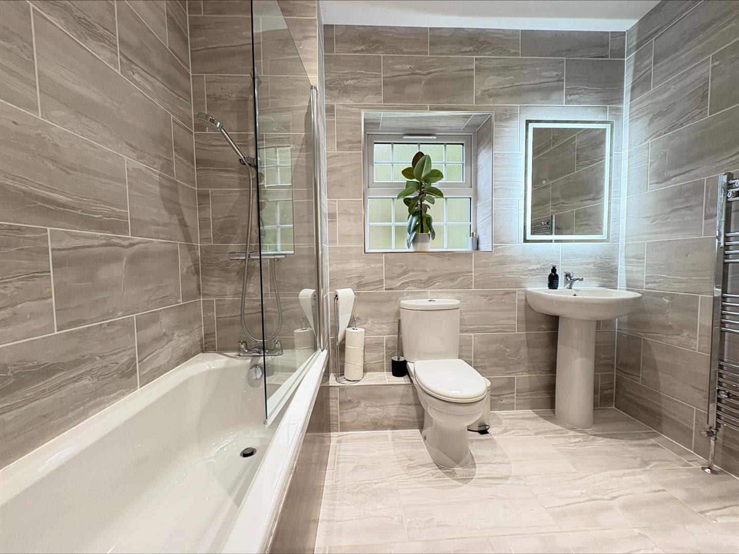 Modern bathroom fitted with a three piece suite consisting of a panelled bath with shower over and glass screen, w/c and wash hand basin. The room is fully tiled in grey with a wall mounted smart mirror, uPVC double glazed window to the rear, heated towel radiator and extractor.
