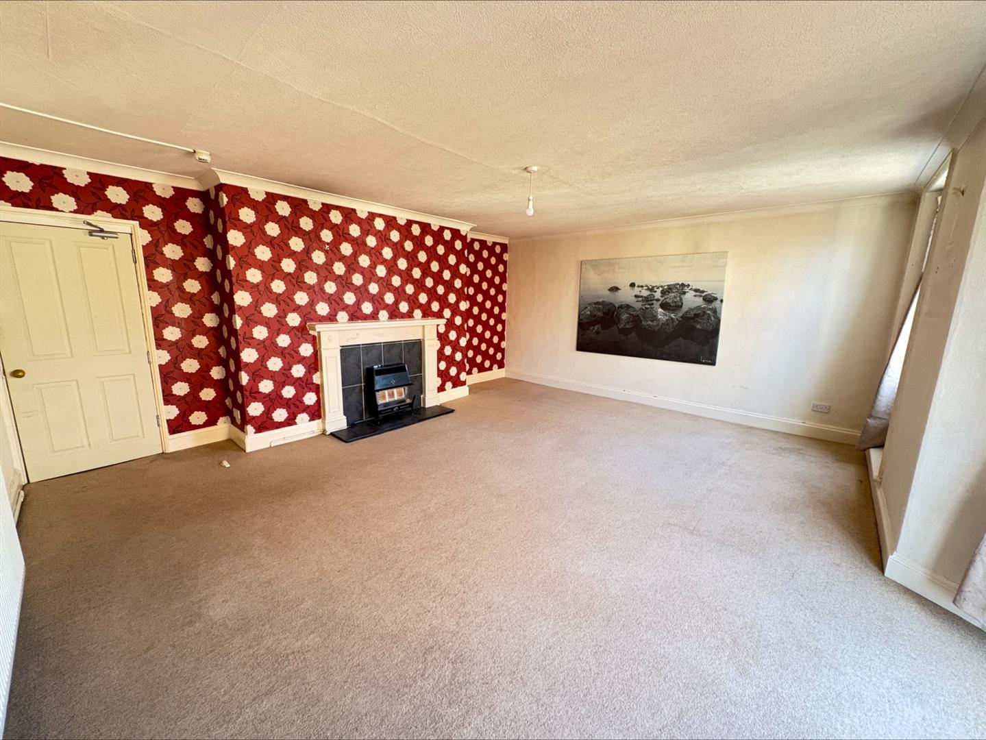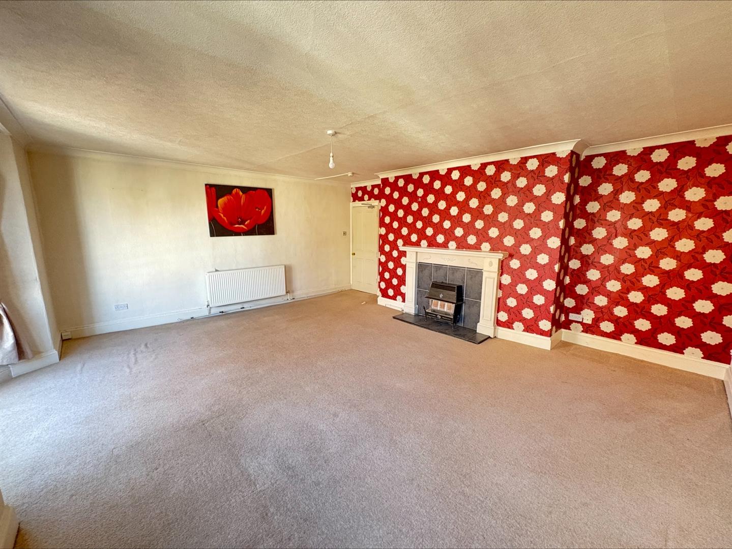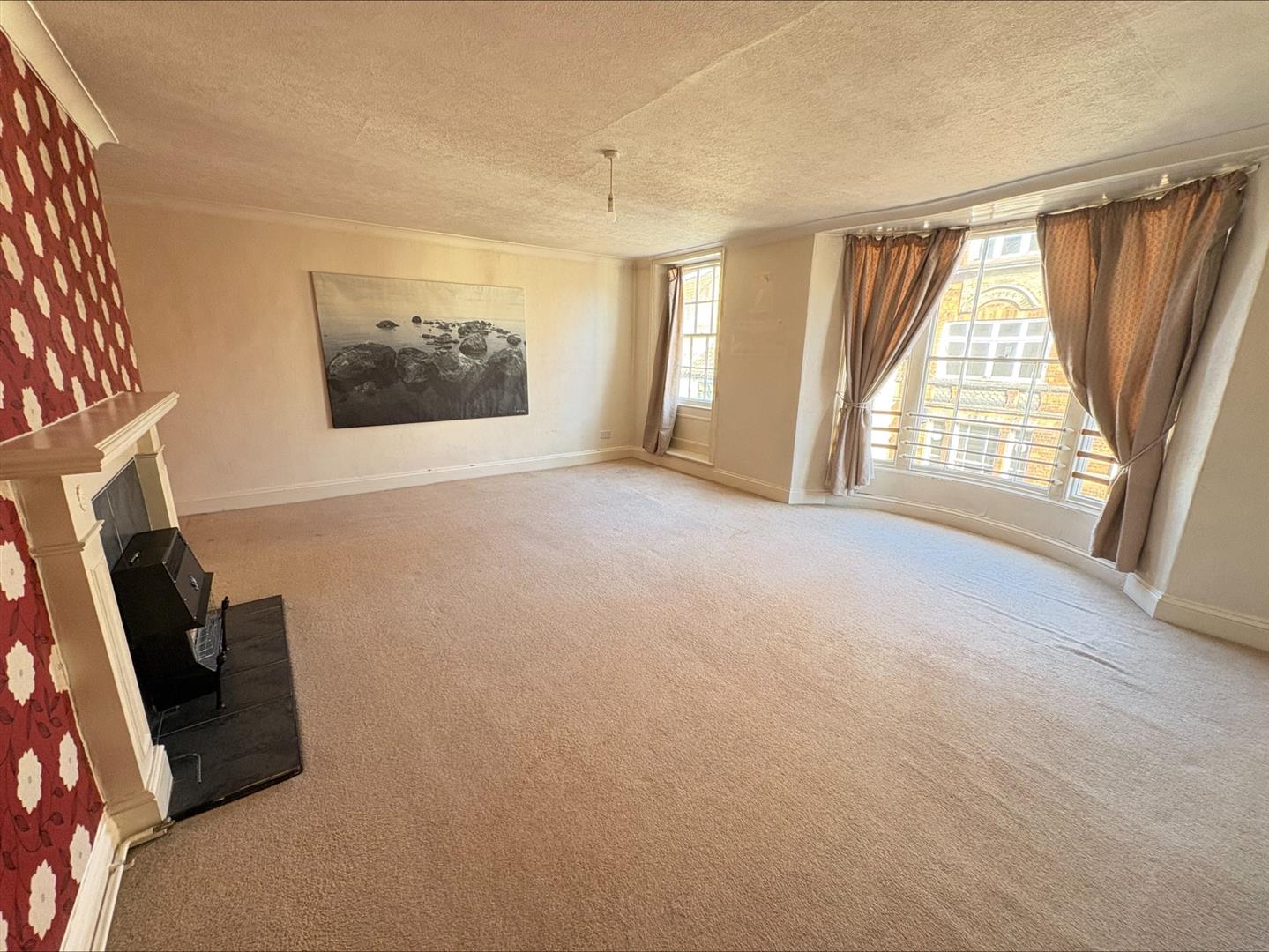 A bright and airy living room with large bow window to front, gas fireplace with grey tile hearth and wooden mantle, radiator and single glazed sash windows to front.