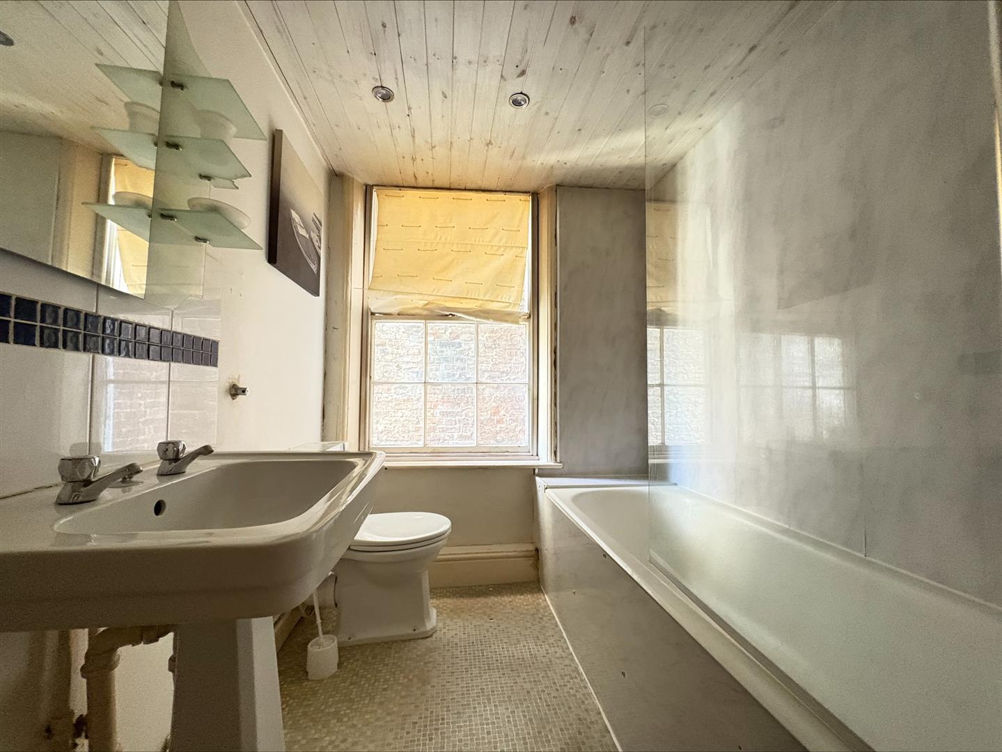A Suite comprising low flush w/c, wash hand basin and panelled bath with shower over, part tiled walls, towel radiator, tile splashbacks, airing cupboard, single glazed sash window to side.