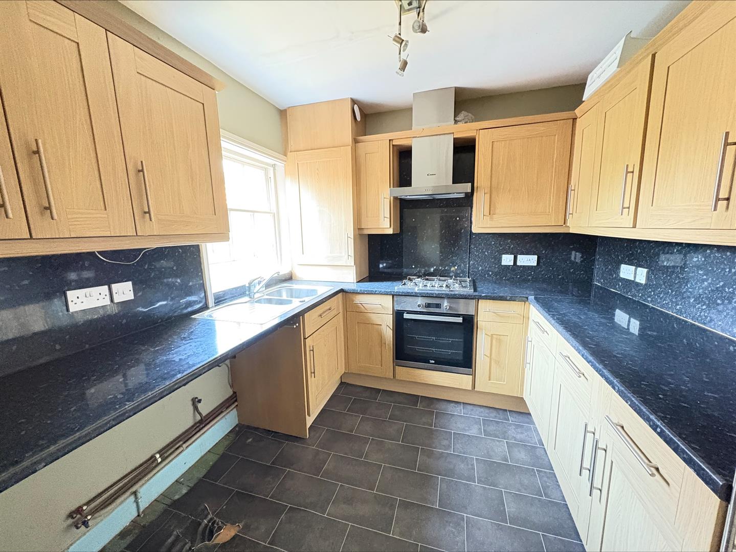 Range of wood effect wall, base and drawer units with marble effect roll top worktop, 4 ring gas hob with Beko oven and stainless steel extractor over, 1.5 bowl stainless steel sink and drainer, space and plumbing for washing machine and tumble dryer, integrated fridge freezer, cupboard housing Vokera boiler, single glazed sash window to rear.