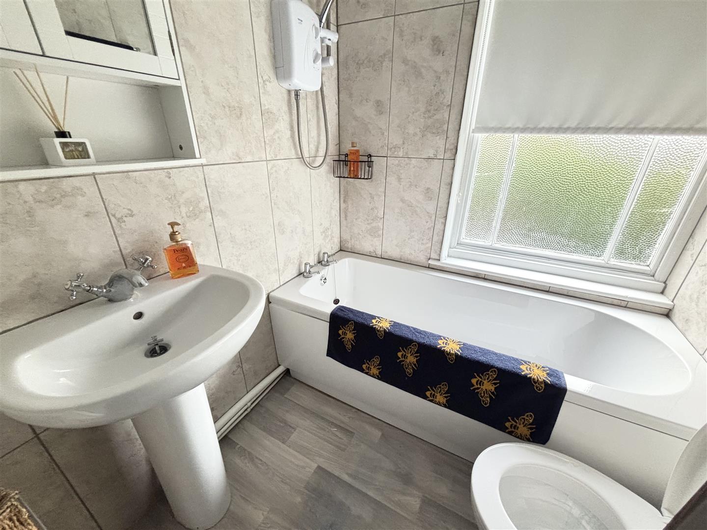 Fitted with a three piece white suite consisting of a wash hand basin with mixer tap, w/c and panelled bath with shower over. There is a single glazed privacy glass window to the side, tiled walls, spotlights to the ceiling, extractor and storage cupboard with hot water cylinder.