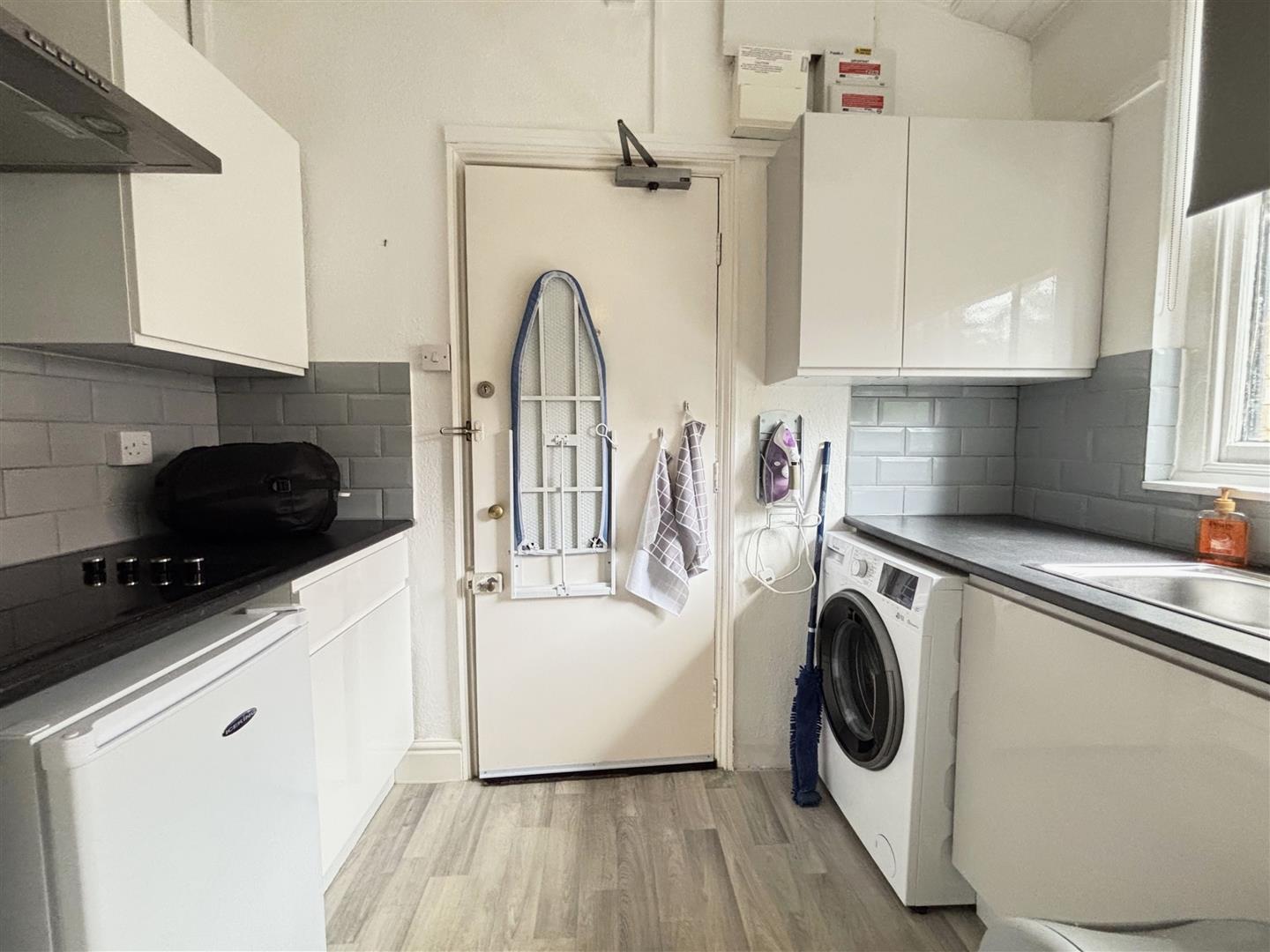 The kitchen is fitted with a range of white units with a contrasting worktop over incorporating a 1 bowl stainless steel sink unit with drainer and mixer tap, 4 ring electric hob with stainless steel extractor above, space for washing machine and larder fridge. The splashbacks are tiled with a wooden single glazed window to the side and consumer units. Steps lead up into:-